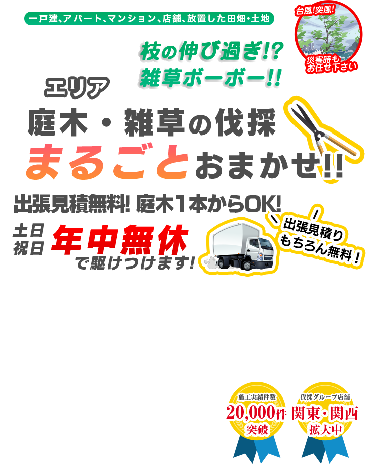 | A | 基本的にはかかりません。埼玉県であれば、出張費はいただいておりません。 ※ 上記以外の遠方の場合は、別途出張費がかかります。 ※ 最低料金総額3,000円~となります。 ※ 伺った際、作業が困難な場合(ツタが絡んでいる、足場が狭い、等)は、別途料金がかかる場合もあります。 |