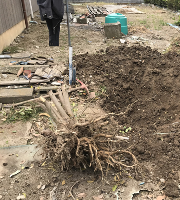 お庭の壁の際に植えていた植木を伐根いたしました。